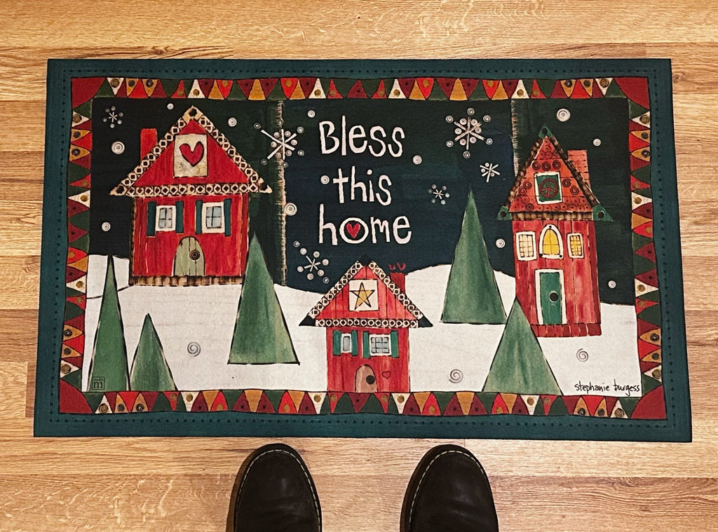 Painted Peace doormat. Art and design by Stephanie Burgess. Weatherproof for indoor/and gentle outdoor use. Non-slip recycled rubber backing. Mat liner sold separately.